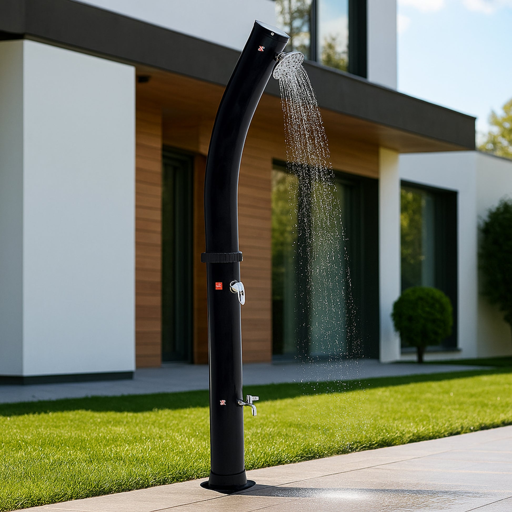 Combining elegant black with a curved shape, the Curved 38L outdoor solar shower offers ultimate outdoor comfort. It's the perfect addition to any garden, patio, or pool area—stylish, space-saving, and functional.