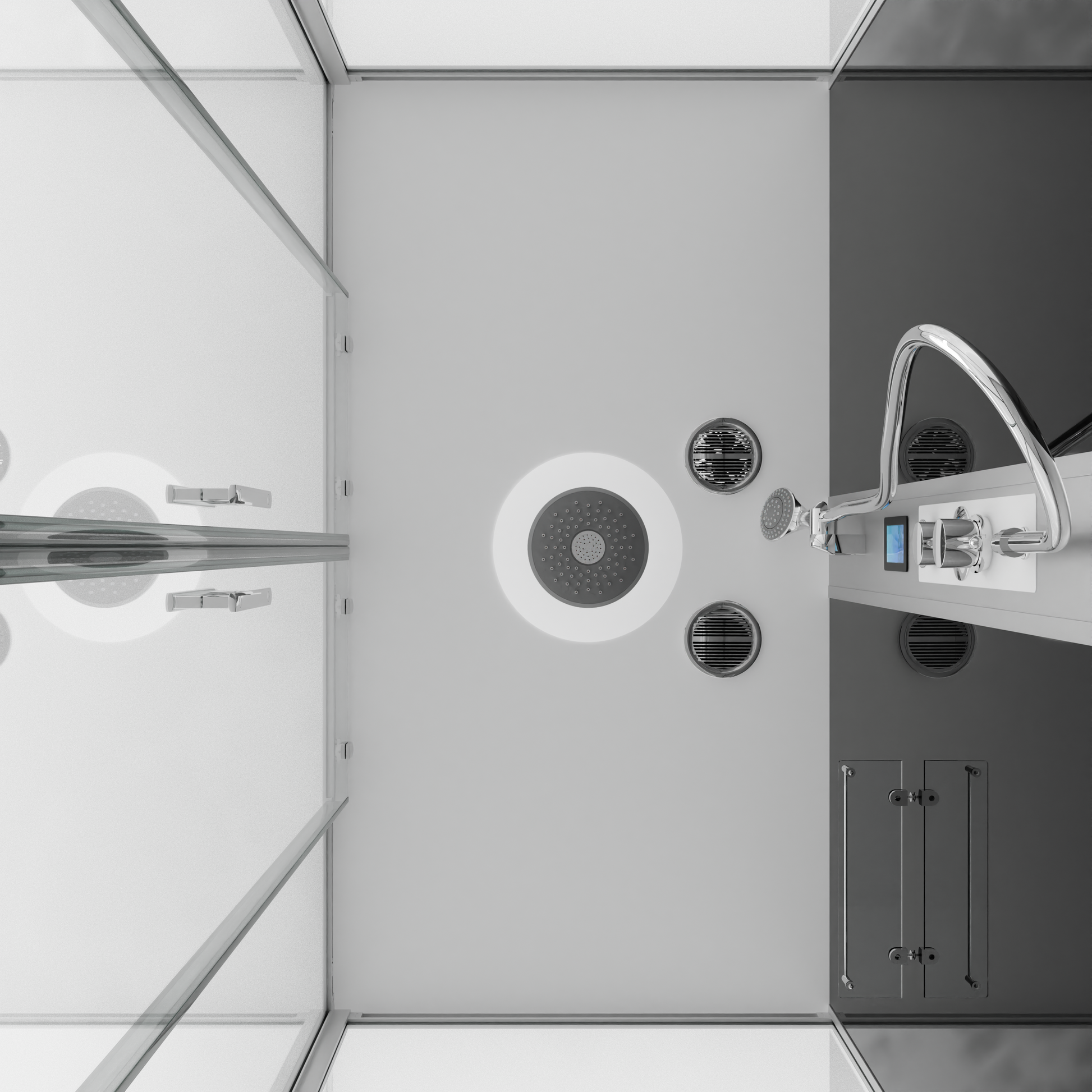 The New York shower enclosure features a selection of sophisticated technical features that transform every shower into an experience. A large overhead shower and a three-function hand shower offer a variety of relaxation options. The centerpiece is the aluminum stainless steel panel with a jet massage nozzle. Everything is conveniently controlled via a modern touchscreen panel, which also features an integrated radio. A glass roof with LED lighting, as well as built-in speakers and a fan, ensure the ultimate wellness experience.