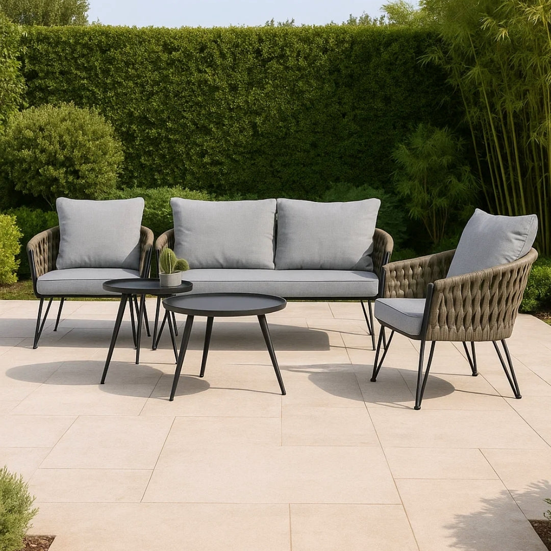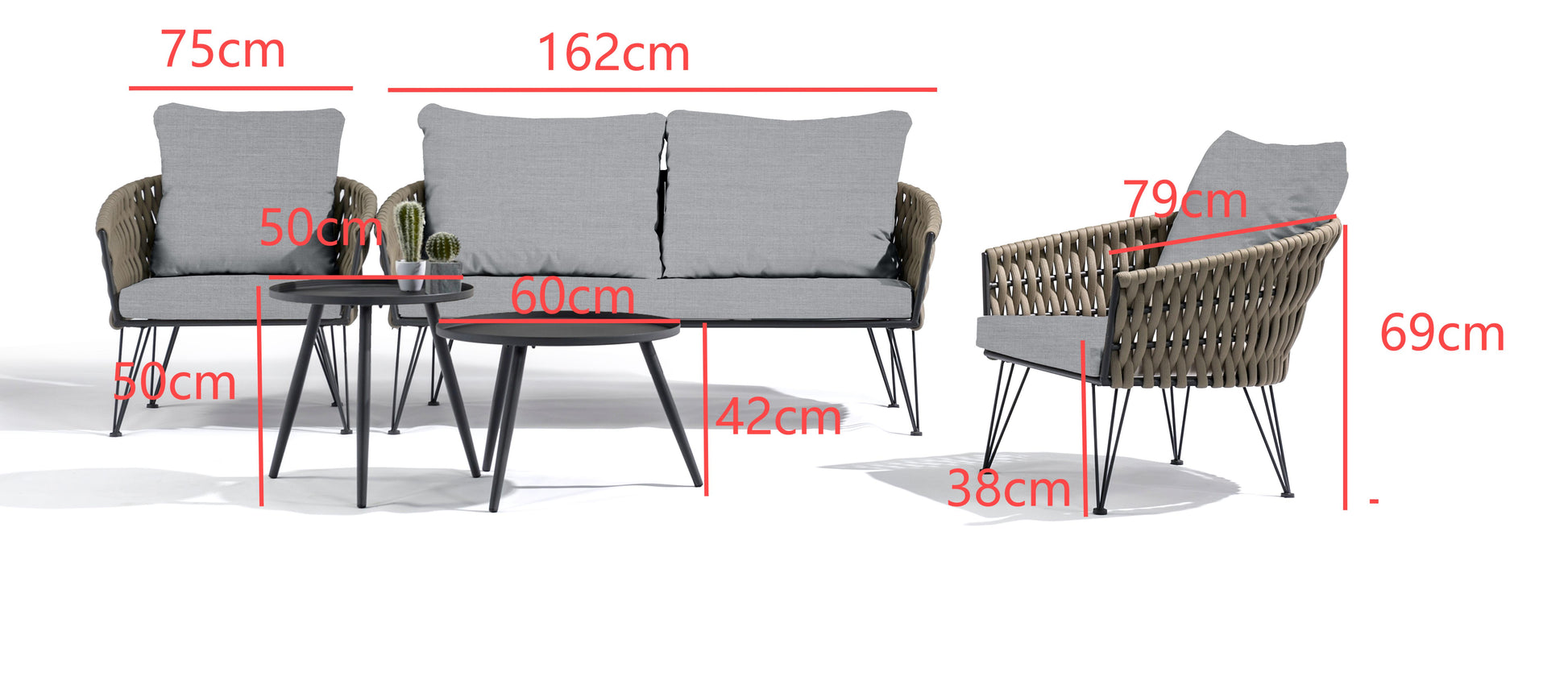 Elige el conjunto de salón de jardín y dale más diseño y sensación de bienestar a tu jardín. Las piernas delgadas dan un estilo contemporáneo. Las mesas auxiliares incluidas en el envío se pueden combinar como se desee y convencen por su diseño moderno.