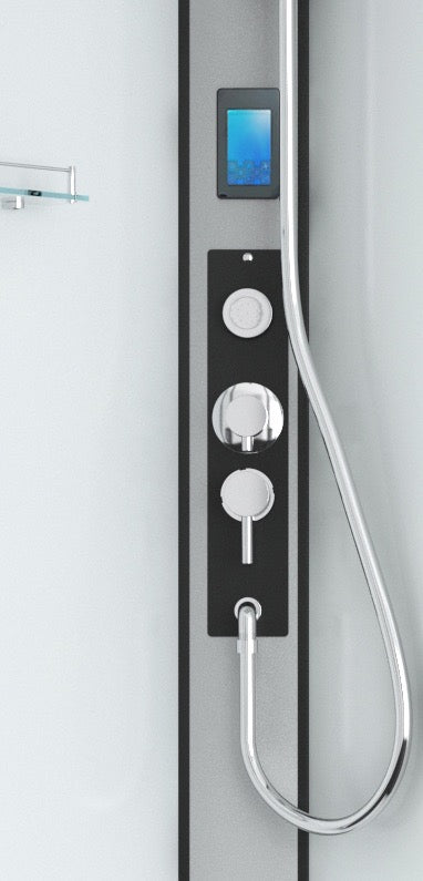 Las características técnicas del Miami Black hacen de cada ducha una experiencia especial. Además de un generoso cabezal de ducha y una ducha de mano con tres funciones, ofrece un panel de acero inoxidable de aluminio con una boquilla de masaje a chorro. El conjunto se maneja a través de un panel de pantalla táctil intuitivo, que también incluye una radio integrada. Un techo de cristal con iluminación LED, así como altavoces integrados y un ventilador, completan el paquete de bienestar y crean un ambiente acogedor.