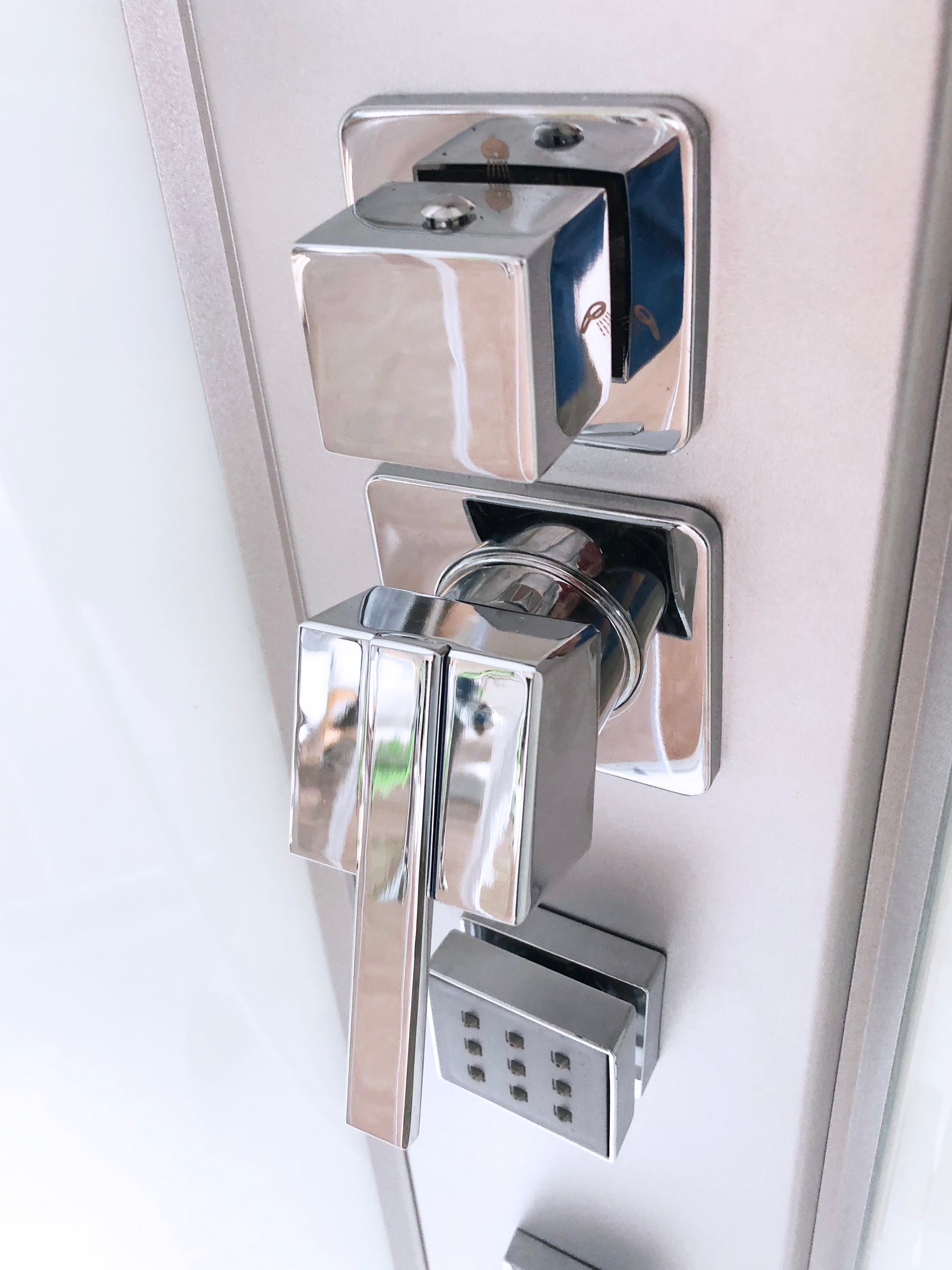 La mampara de ducha completa TC05S de Sanotechnik se caracteriza por su diseño minimalista y sus prácticas características. Cuenta con repisas de cristal y tres chorros de masaje. Las puertas correderas con ruedas dobles garantizan una fácil apertura.