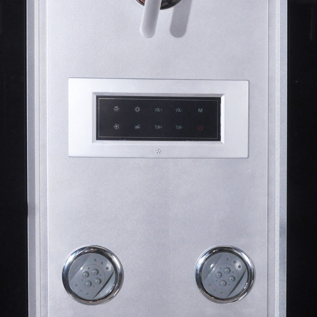 La completa combinación de cabina de ducha SALSA de Sanotechnik se convierte gracias a su generoso equipamiento en un oasis de bienestar para el hogar. El ambiente elegante se ve subrayado por el cristal trasero negro, el cristal frontal tintado y los perfiles de aluminio plateados. La combinación de cabina de ducha también dispone de una unidad de control electrónico con pantalla táctil, una radio con altavoces e iluminación de techo. SALSA dispone de 4 jets en el panel de masaje de la ducha, 4 jets de masaje de espalda, una ducha de mano y un cabezal de ducha con luz LED de color integrada y un ventilador.