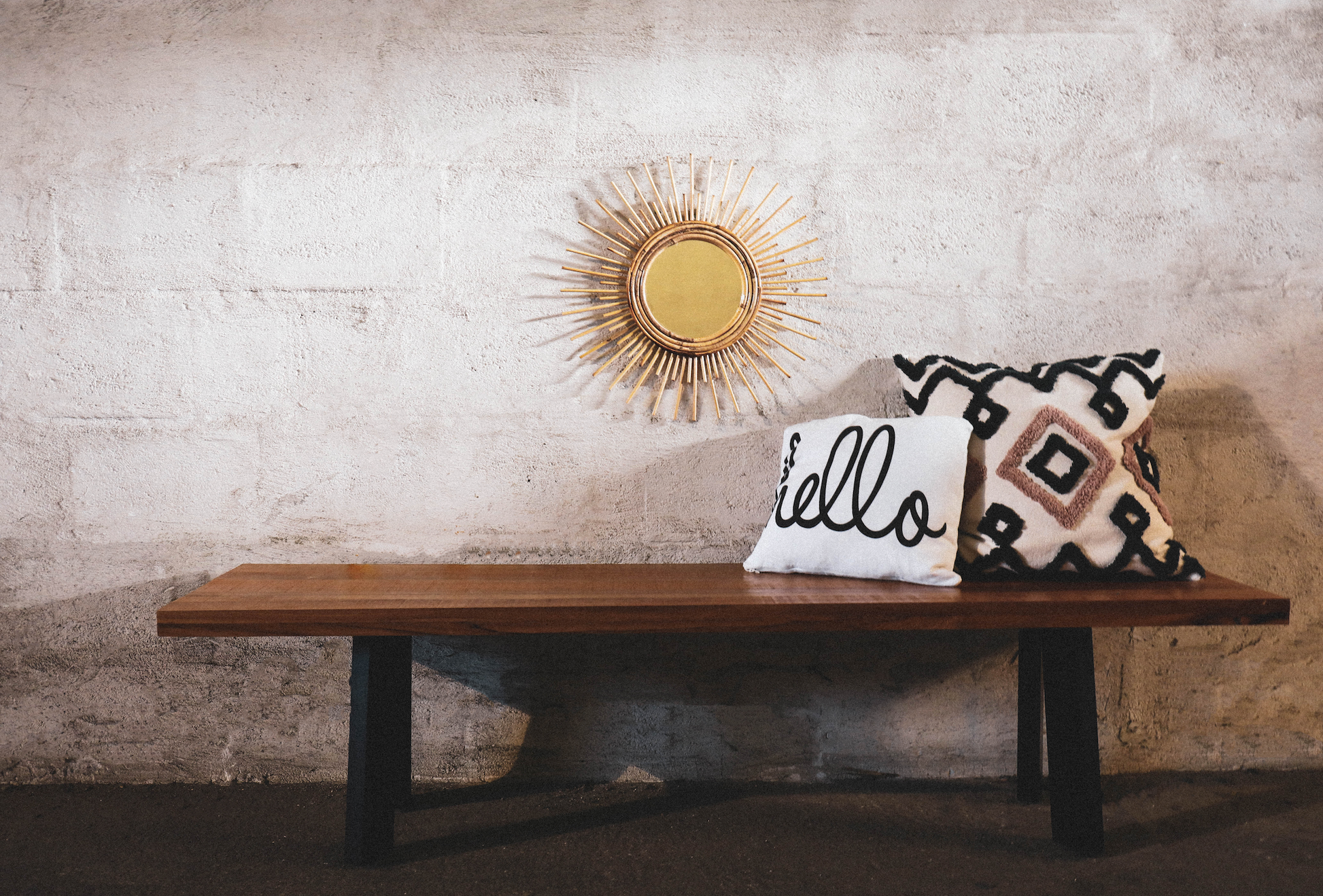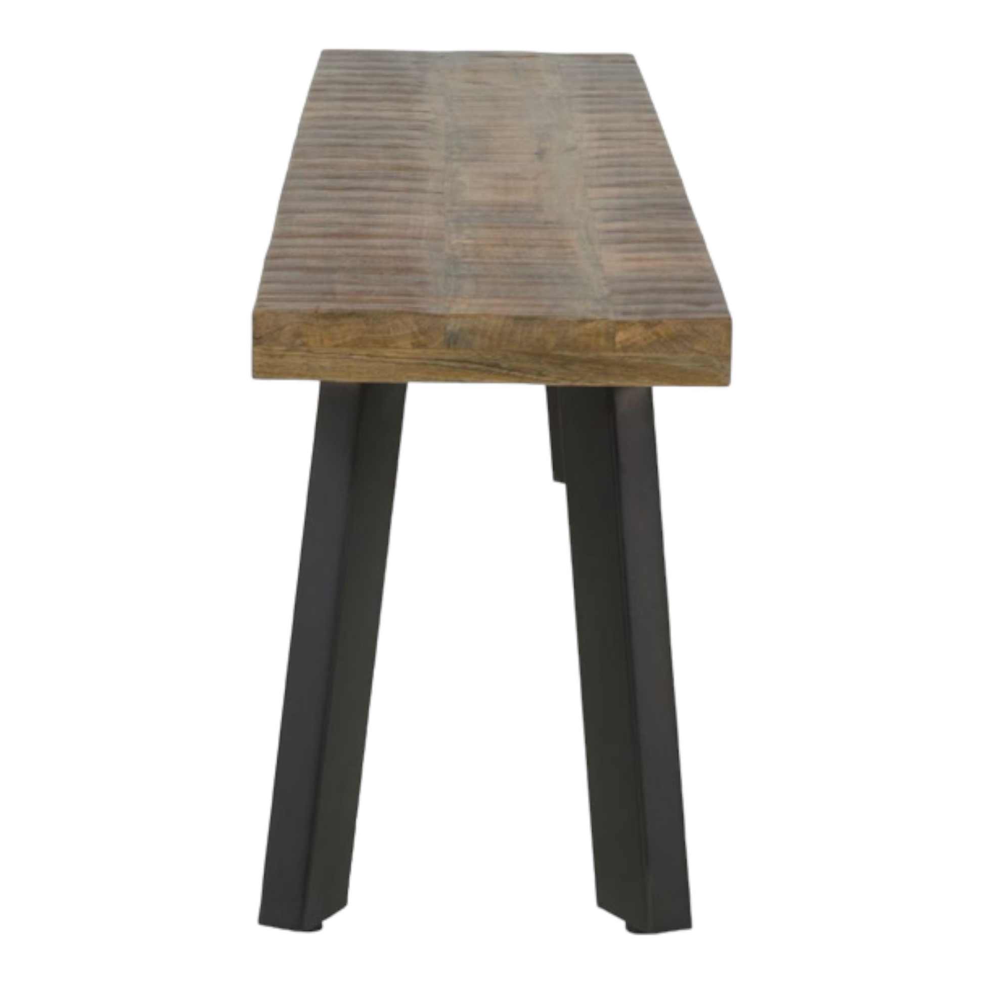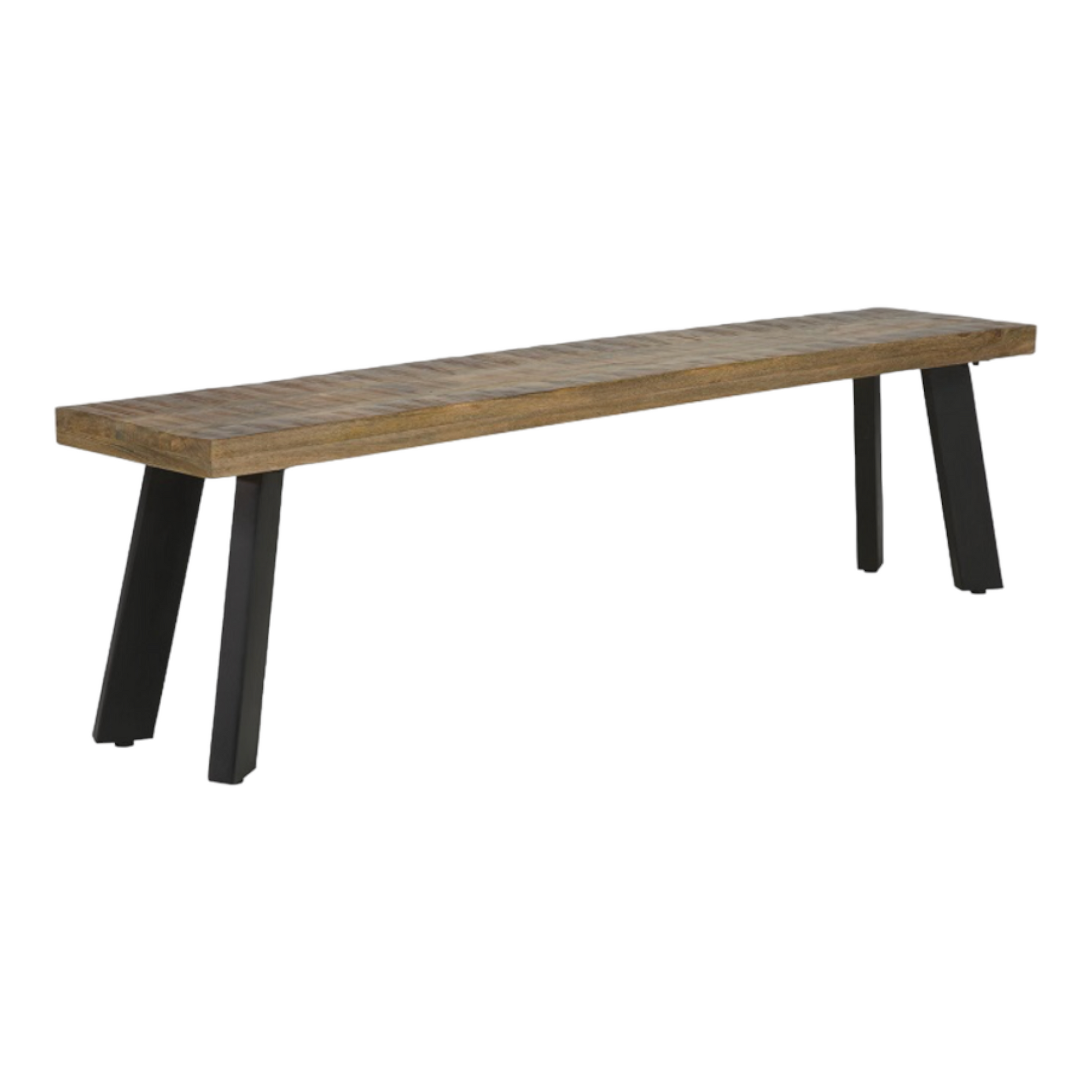 El banco Marlena está disponible en dos tamaños diferentes. Los materiales con los que está fabricado el banco son acero y madera de teca reciclada. La teca se obtiene de muebles viejos y se reutiliza.