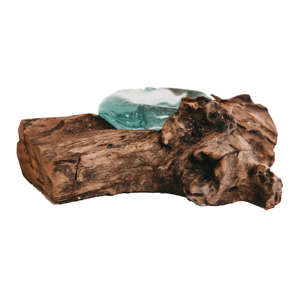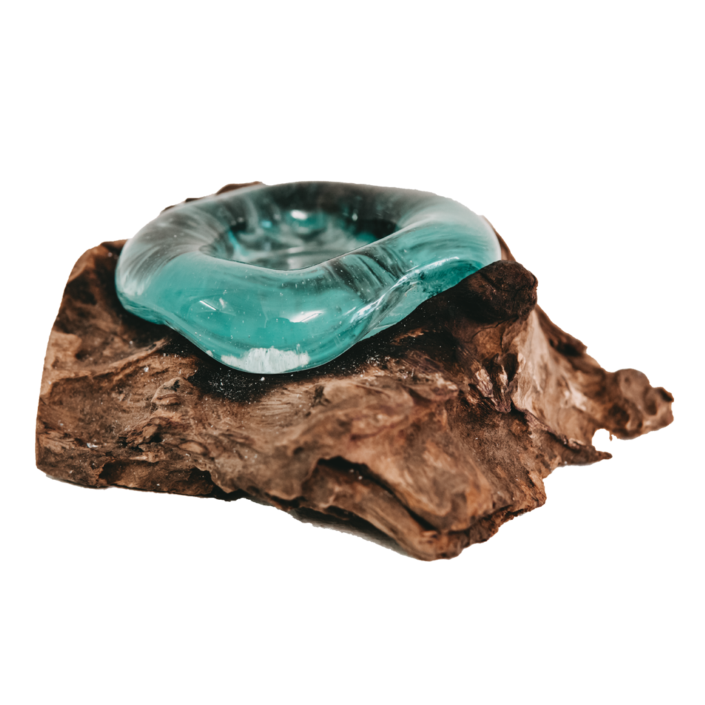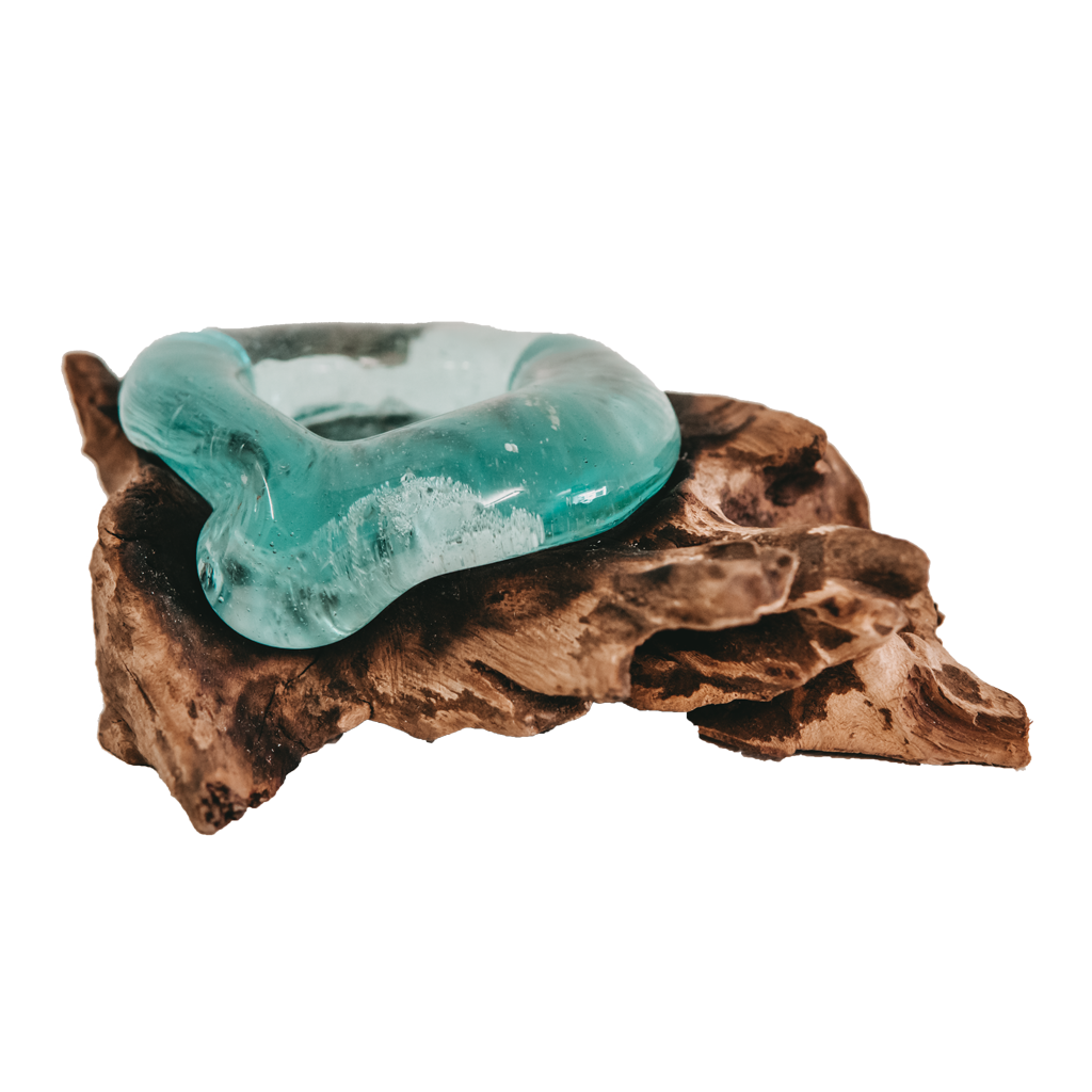 Diese mundgeblasene Schale verbindet auf wunderschöne Weise Designerstück und traditionelle Glasbläserkunst. Die Schale entsteht, indem der Glasmacher die Quarzsandschmelze mit seiner Glasmacherpfeife direkt auf die Teakholzwurzel bläst. Dadurch verschmelzen Schale und Wurzel zu einer einzigartigen Tischskulptur, denn jede Schale passt immer nur zu ihrer Wurzel, die der fertigen Schale zugleich als Ständer dient.