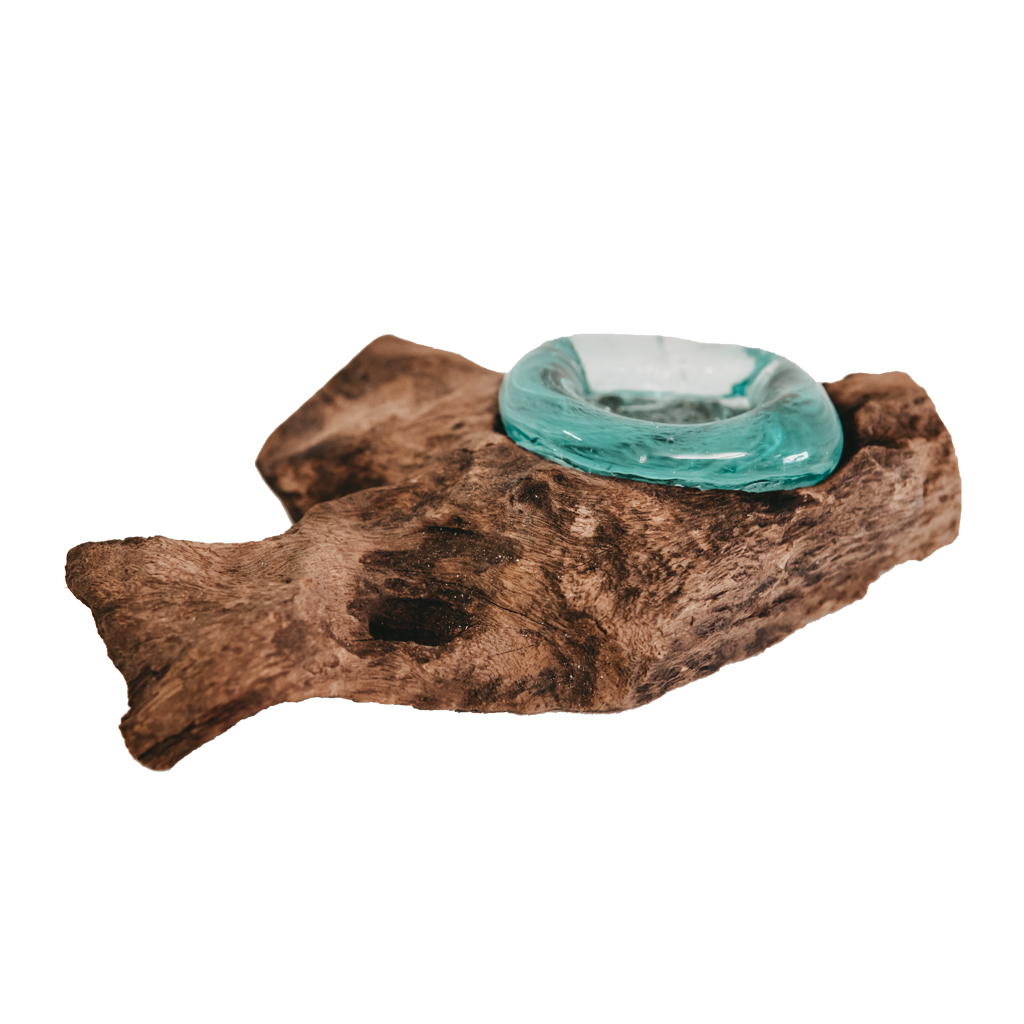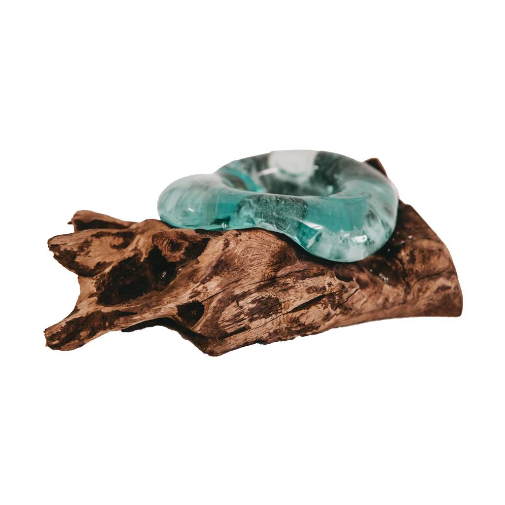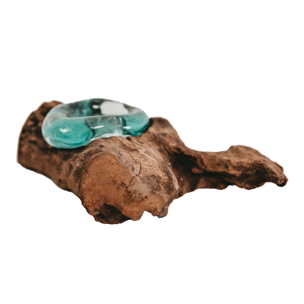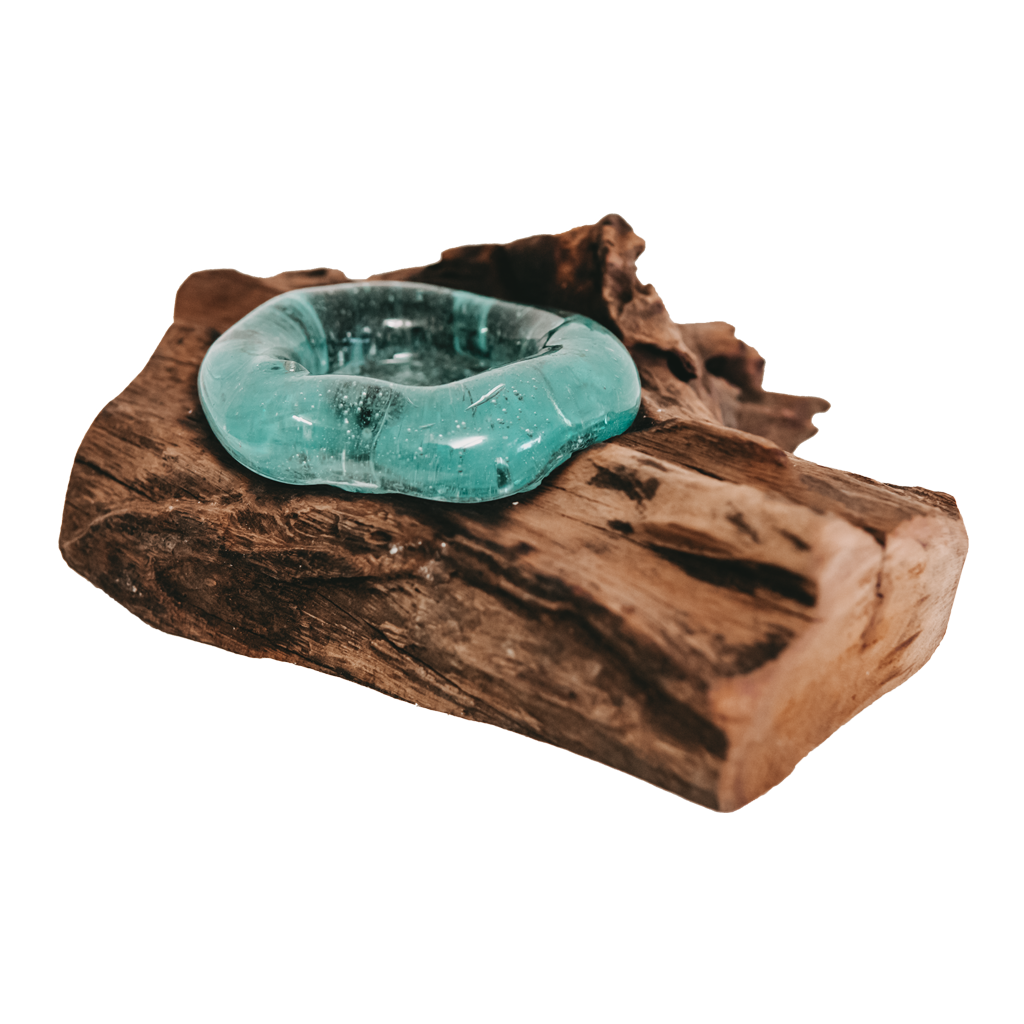 Diese mundgeblasene Schale verbindet auf wunderschöne Weise Designerstück und traditionelle Glasbläserkunst. Die Schale entsteht, indem der Glasmacher die Quarzsandschmelze mit seiner Glasmacherpfeife direkt auf die Teakholzwurzel bläst. Dadurch verschmelzen Schale und Wurzel zu einer einzigartigen Tischskulptur, denn jede Schale passt immer nur zu ihrer Wurzel, die der fertigen Schale zugleich als Ständer dient.