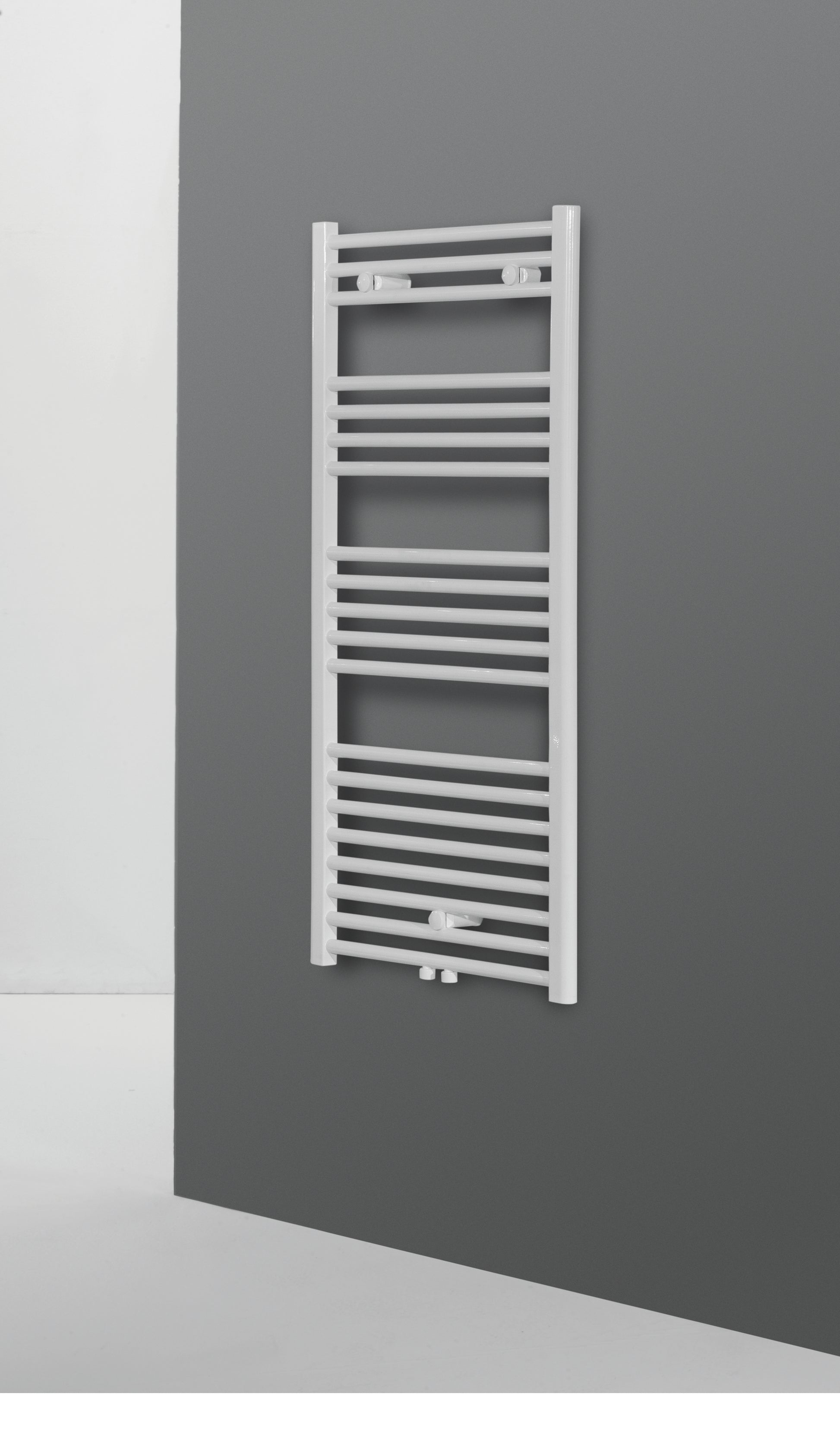 Hinweis: Die gebogene Ausführung bietet etwas mehr Platz in der Tiefe (zwischen Wand und Heizkörper) für Handtücher als die gerade Variante