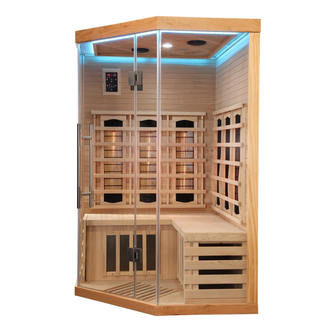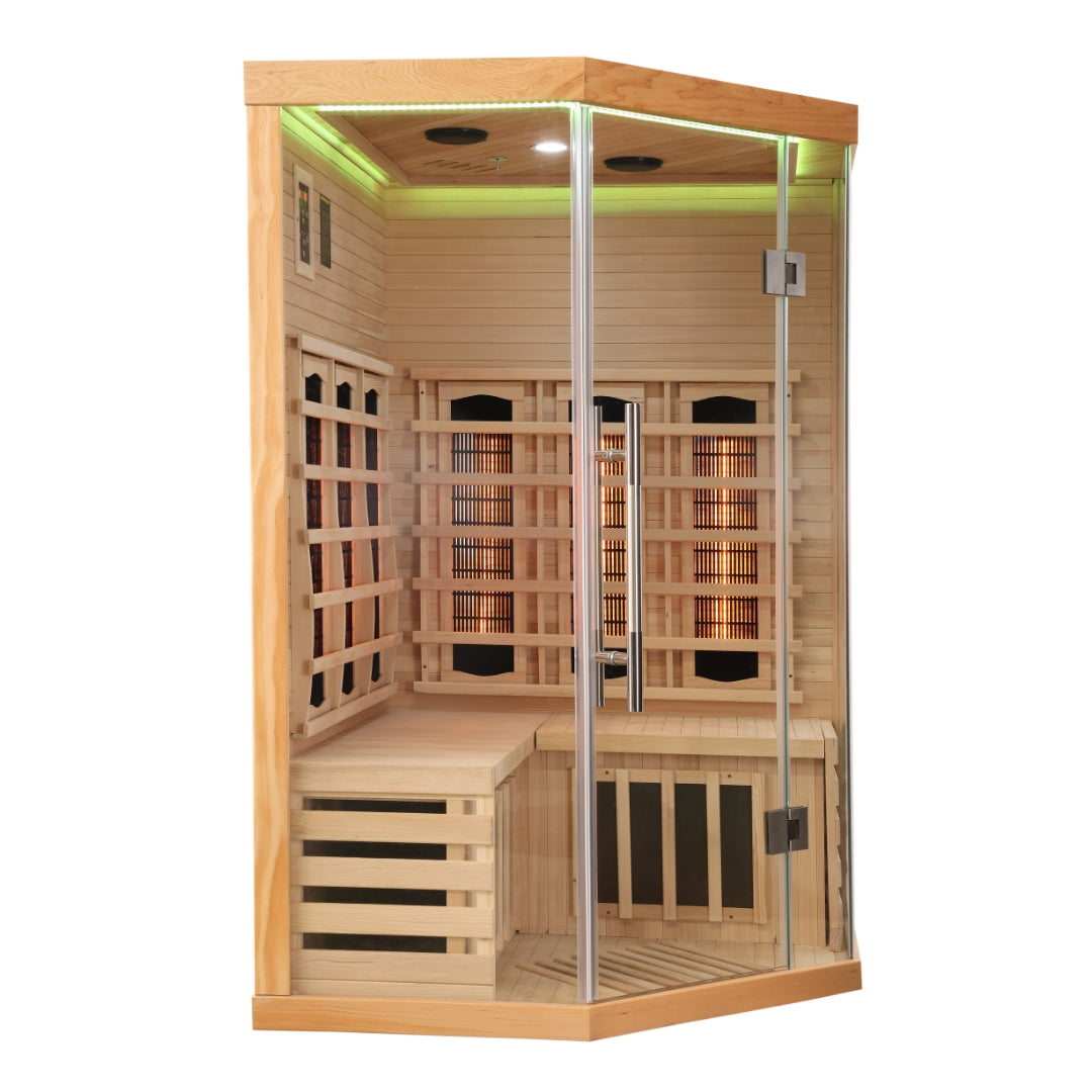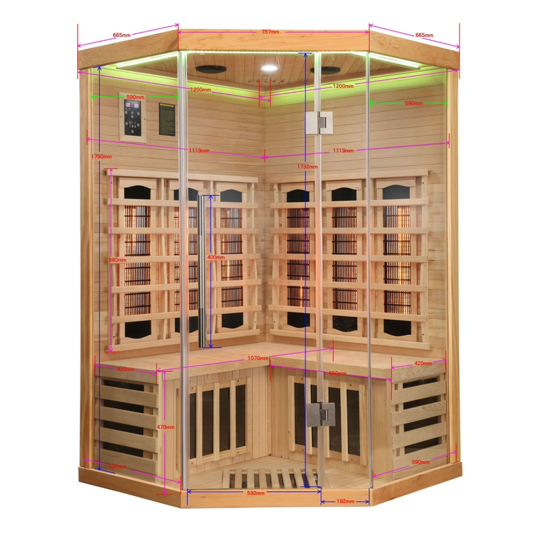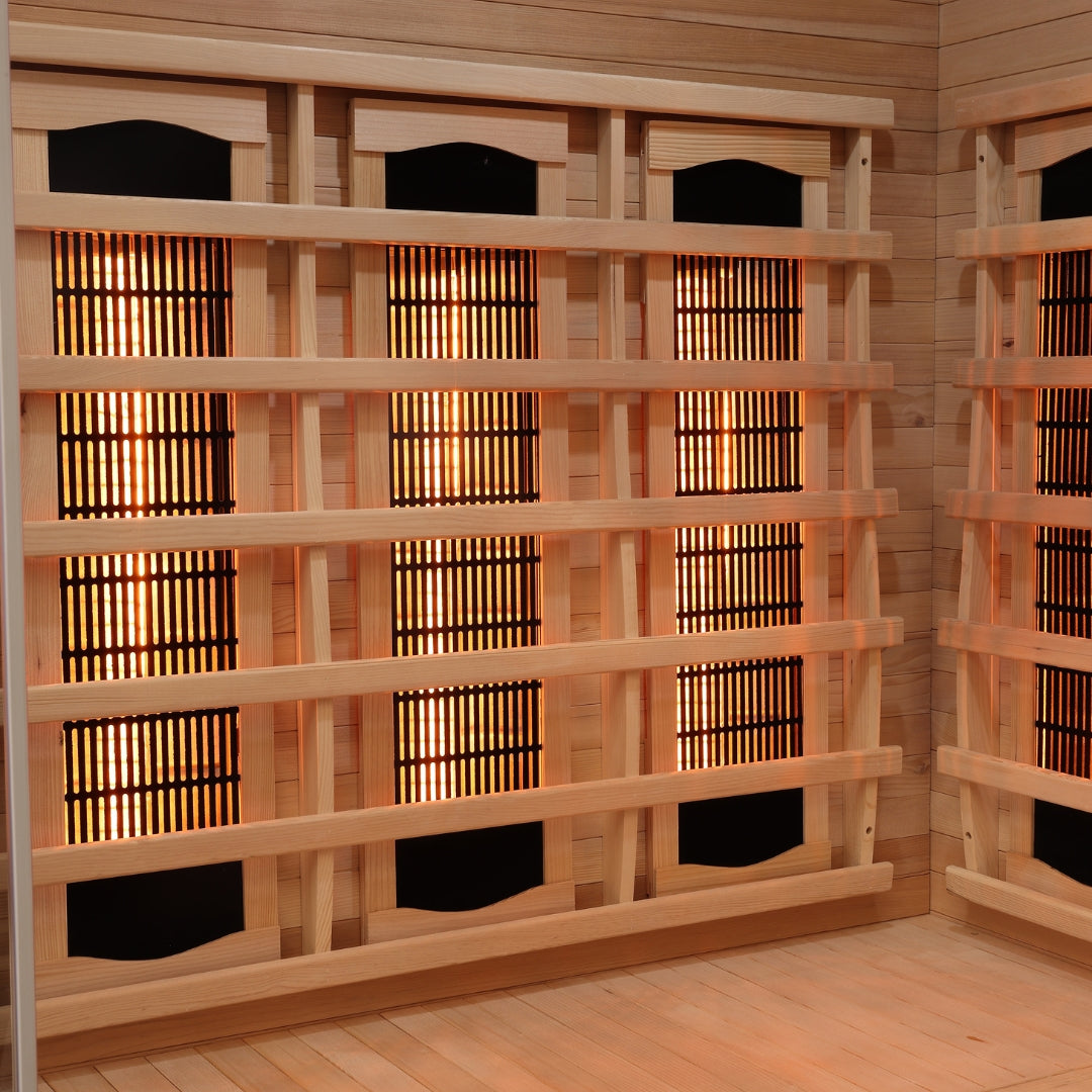 Die großflächige Heizplatte sorgt für eine gleichmäßige Wärmeverteilung und ein angenehmes Raumklima. Ergänzt wird das Wellness-Erlebnis durch eine integrierte Farblichtherapie, die je nach Lichtfarbe beruhigend, ausgleichend oder aktivierend wirkt.