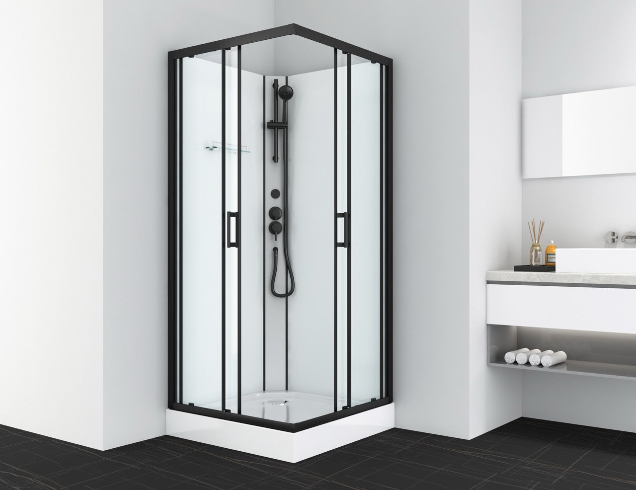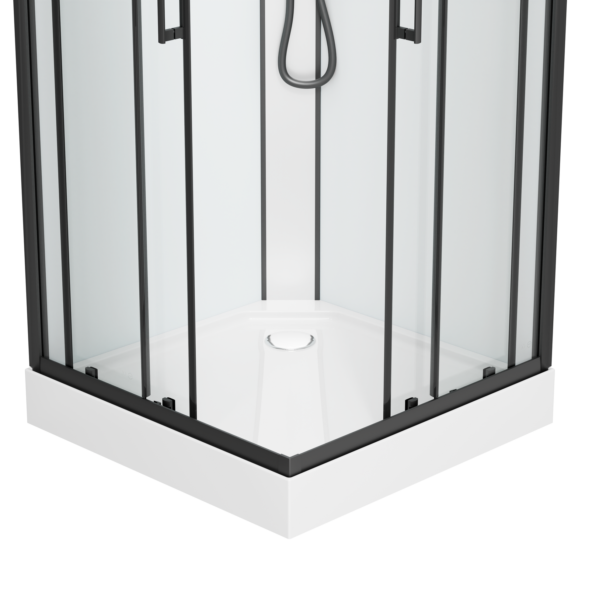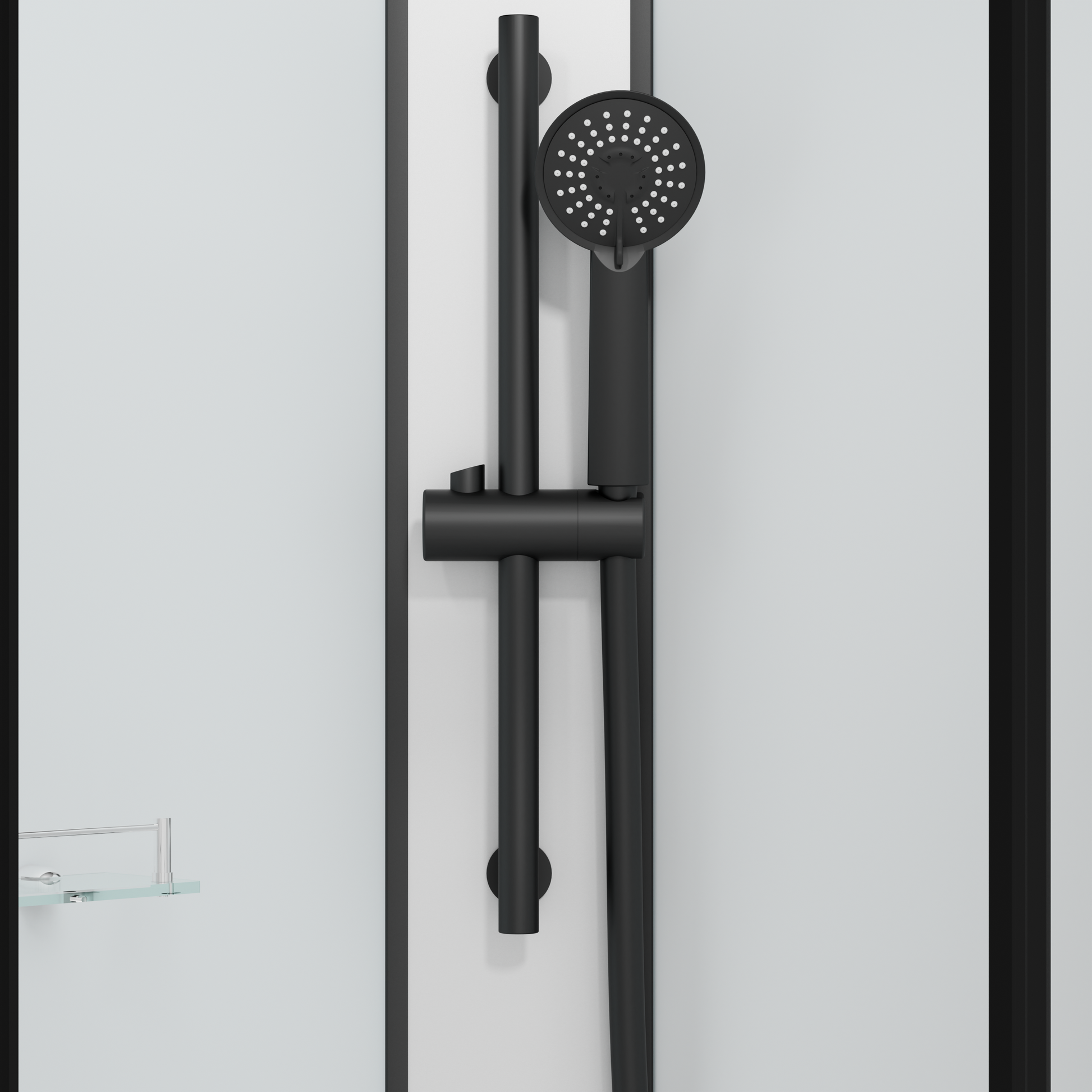 Die Denver Black punktet mit Sicherheitsglas von höchster Qualität: Die Tür und das Glasfixteil sind aus 5 mm starkem Sicherheitsglas gefertigt, während die Rückwand aus 4 mm weißem Sicherheitsglas besteht, das nicht nur Schutz bietet, sondern auch das Licht im Raum hell und einladend verteilt. Die schwarzen Alu-Profile und die doppelten ABS-Griffe in Schwarz verstärken die robuste Konstruktion und unterstreichen das moderne Design der Kabine.