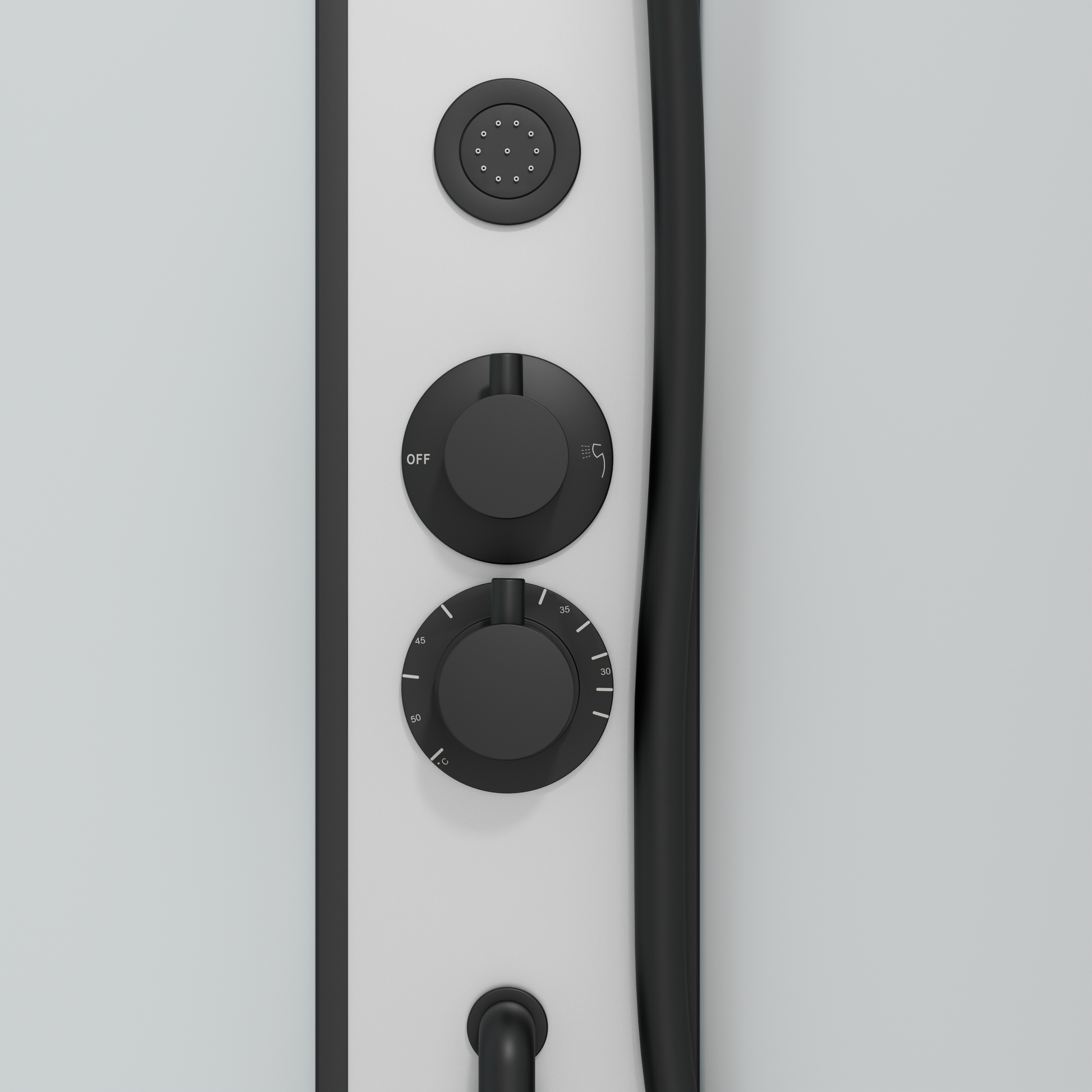 Die Duschkabine ist mit einer Reihe von Ausstattungsmerkmalen versehen, die jedes Duscherlebnis zu einem besonderen Moment machen. Der Thermostatmischer gewährleistet eine konstante Wassertemperatur, und die Handbrause mit drei Funktionen lässt sich individuell anpassen. Ein Paneel mit einer Jet-Massagedüse bietet entspannende Massagewirkung, ideal nach einem langen Tag. Die klappbaren Doppelrollen sowohl oben als auch unten garantieren eine einfache und langlebige Handhabung der Schiebetüren.