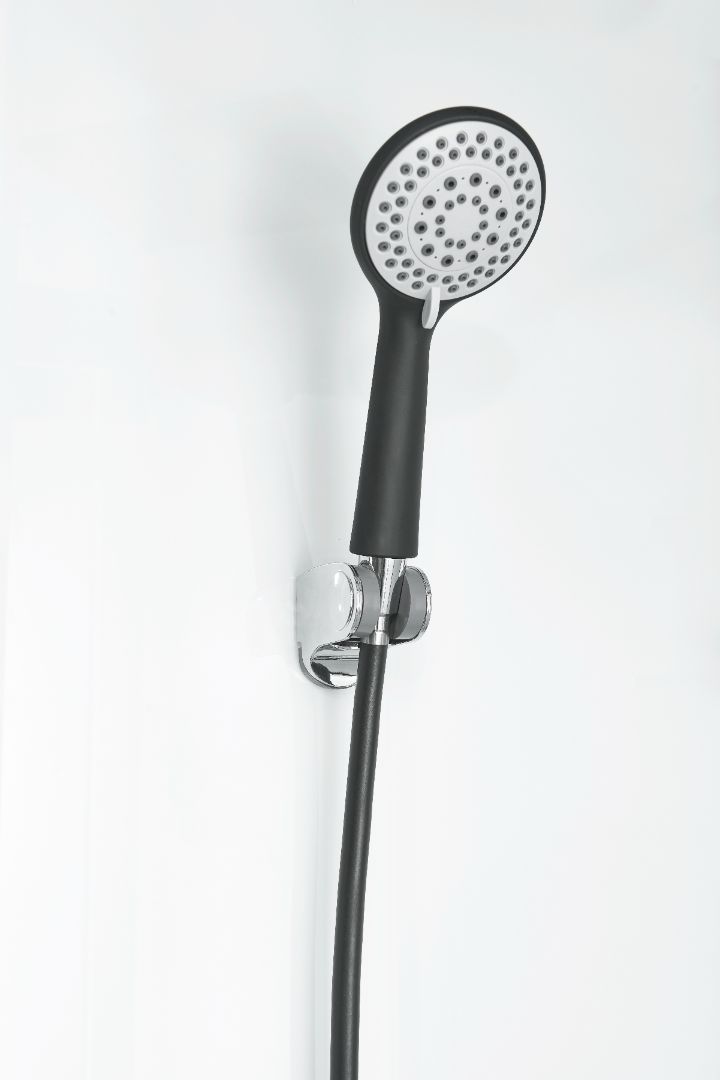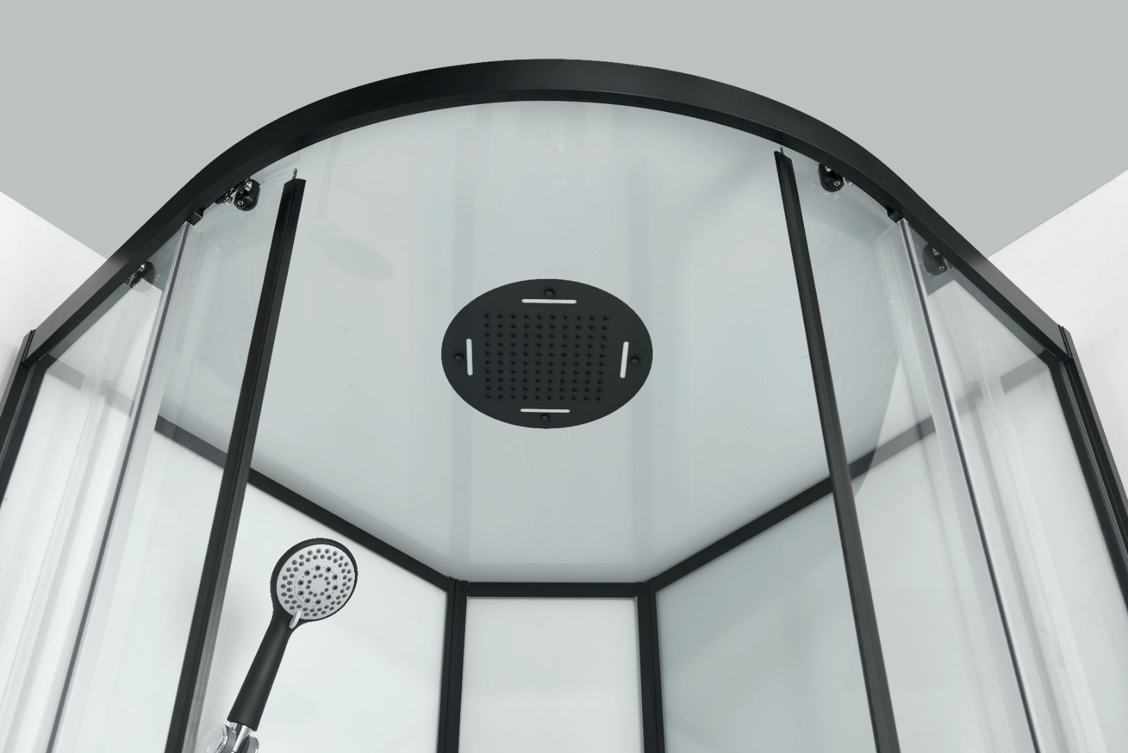 Die Kombination aus weißen Rückwänden und mattschwarzen Profilen verleiht dieser Kabine ihren modernen Look. Die Sky - Eckduschkabine ist komplett fertig. In der Kabine gibt es eine Regendusche, eine Handbrause und Massagedüsen.