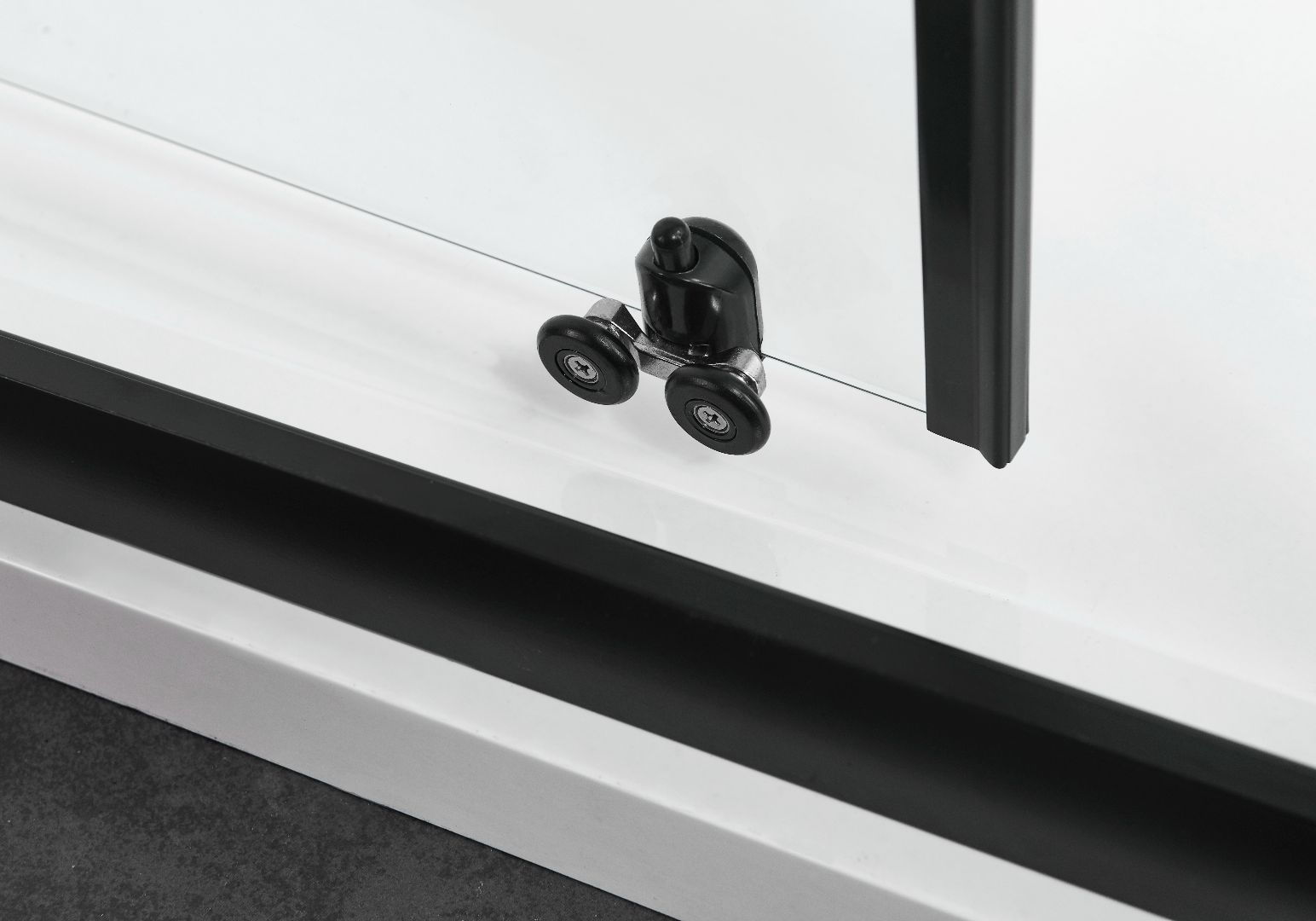 Die hohe Qualität der Materialien garantiert eine lange Lebensdauer. Das Sicherheitsglas ist 5mm dick, die Profile sind aus Aluminium und sowohl oberhalb als auch unterhalb der Schiebetür sind Räder montiert.