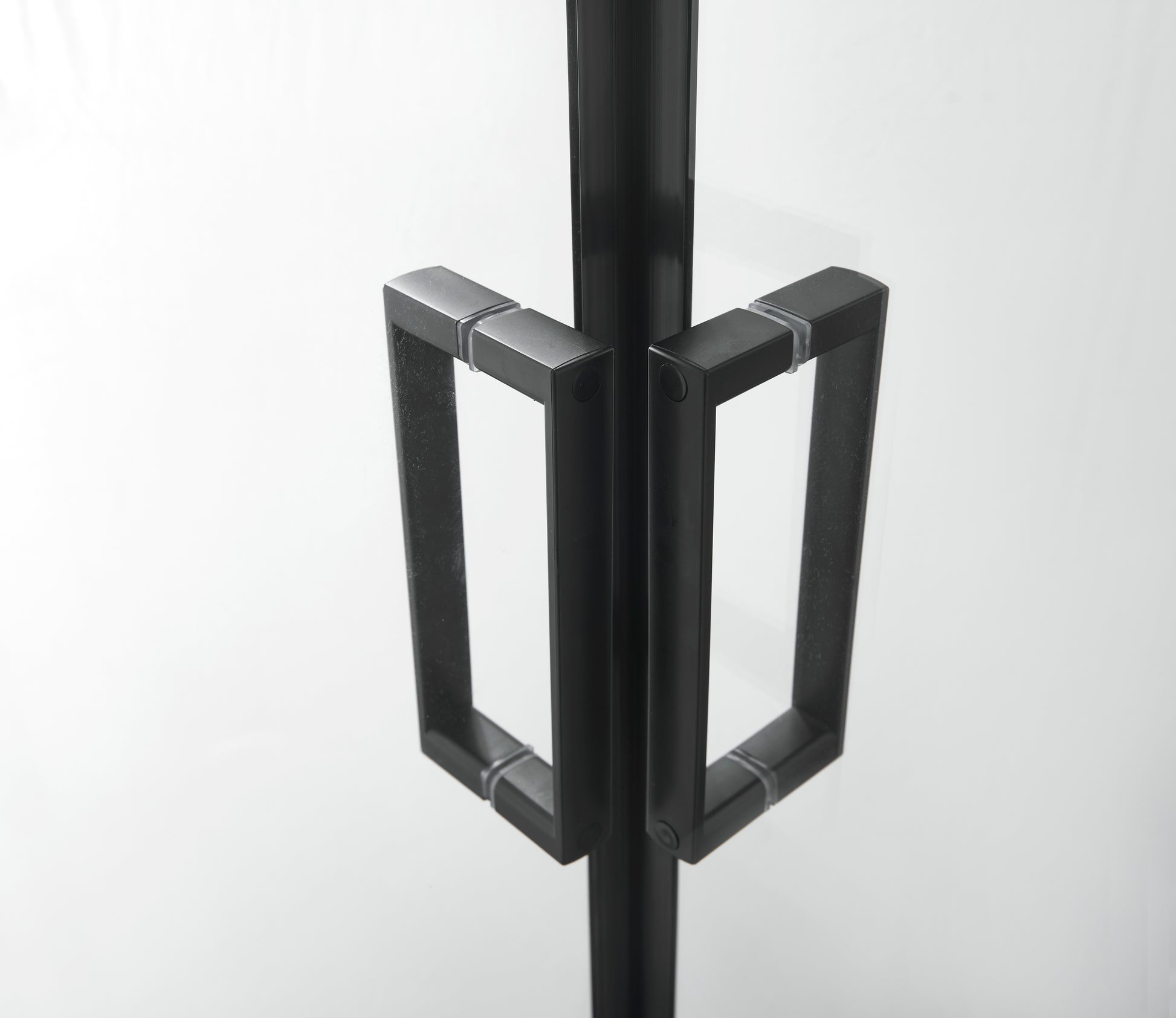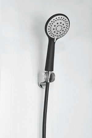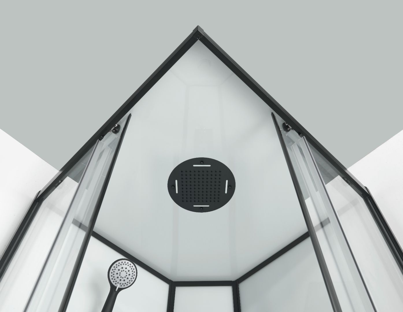 Die Kombination aus weißen Rückwänden und mattschwarzen Profilen verleiht dieser Kabine ihren modernen Look. Die Sky - Eckduschkabine ist komplett fertig. In der Kabine gibt es eine Regendusche, eine Handbrause und sogar Massagedüsen!