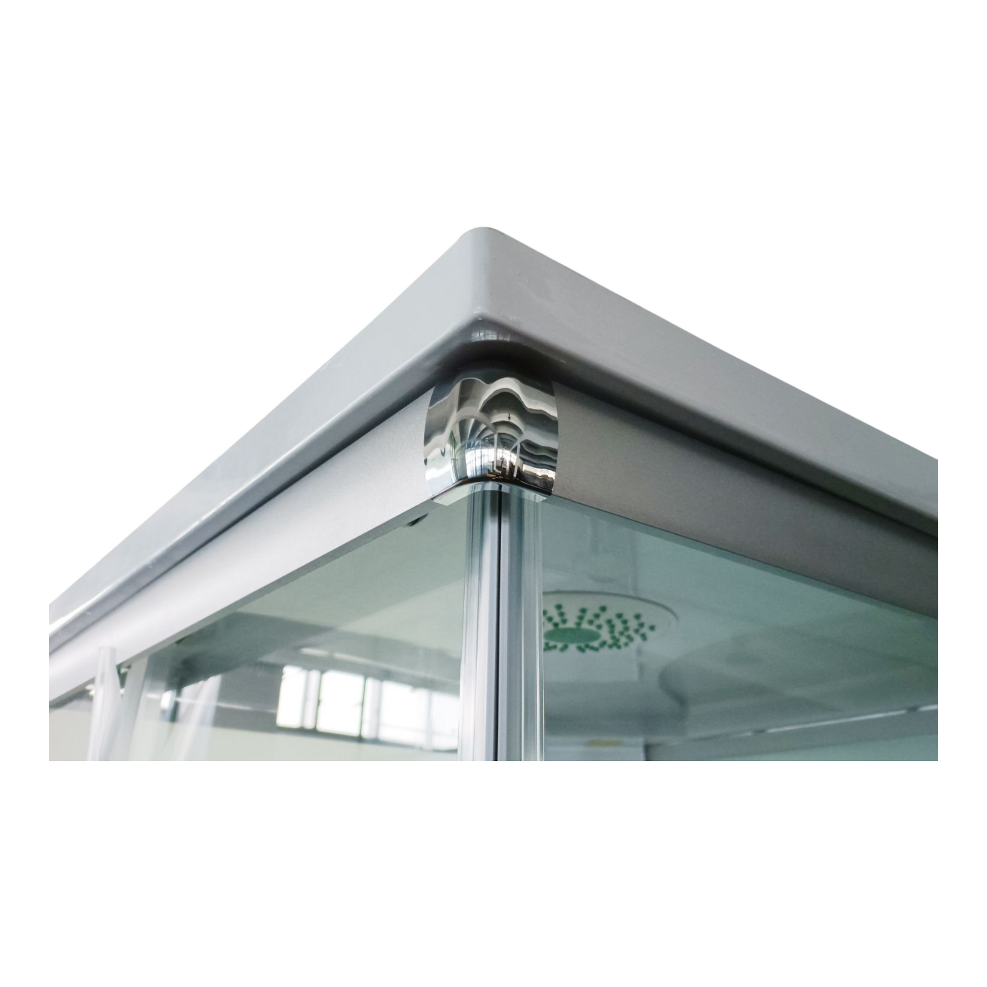 Die Komplettduschkabine TWIST 1 kommt mit 2 Schiebetüren aus Sicherheitsglas. Die Aluminium Profile mit Chrom-Optik verleihen der Duschkabine einen edlen Look. Diese Duschkabine verfügt über 3 Massagedüsen, eine Kopfbrause und eine Handbrause. Die geschlossene Duschkabine ist von hoher Qualität und dennoch sehr einfach zu installieren.