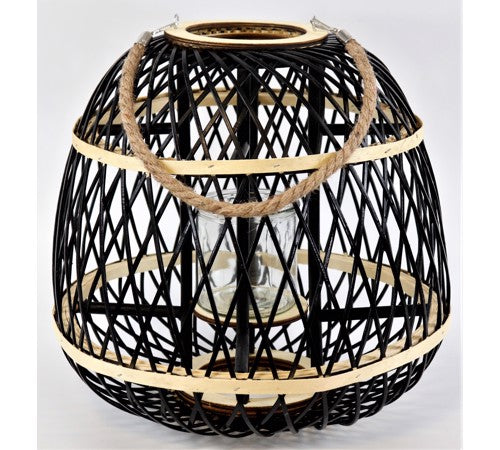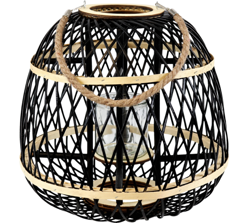 - Ansprechendes Design: Die Laterne überzeugt mit einer Gitterstruktur in schwarz, an der zahlreiche rautenförmige Bambusschnüre in der gleichen Farbe angebracht sind. Zwei hellbraune Querstreben heben sich farblich deutlich von der sonst schwarzen Laterne ab. Ein Glas im Innern rundet das Gesamtkonzept stilvoll ab.
